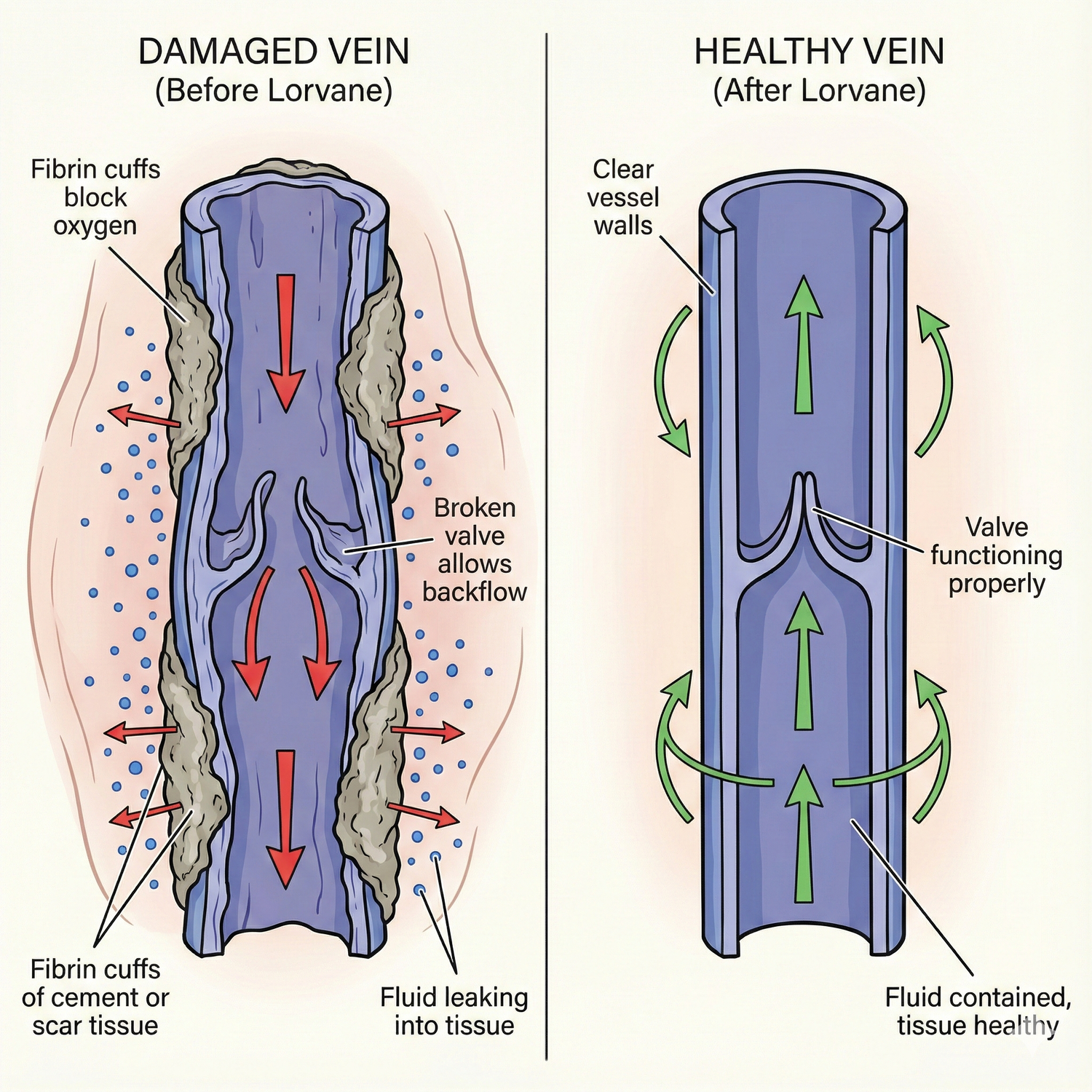 When you've been standing all day, the tiny one-way valves in your leg veins break down. Blood and fluid that should flow UP gets trapped and pools backward. Microscopic "fibrin cuffs" form around your vessels, choking off oxygen and trapping fluid like a dam. That's when you feel it—the throbbing veins, the creepy-crawly sensations, the cement legs, the swelling that forces bigger shoes, the shame hiding in long pants.